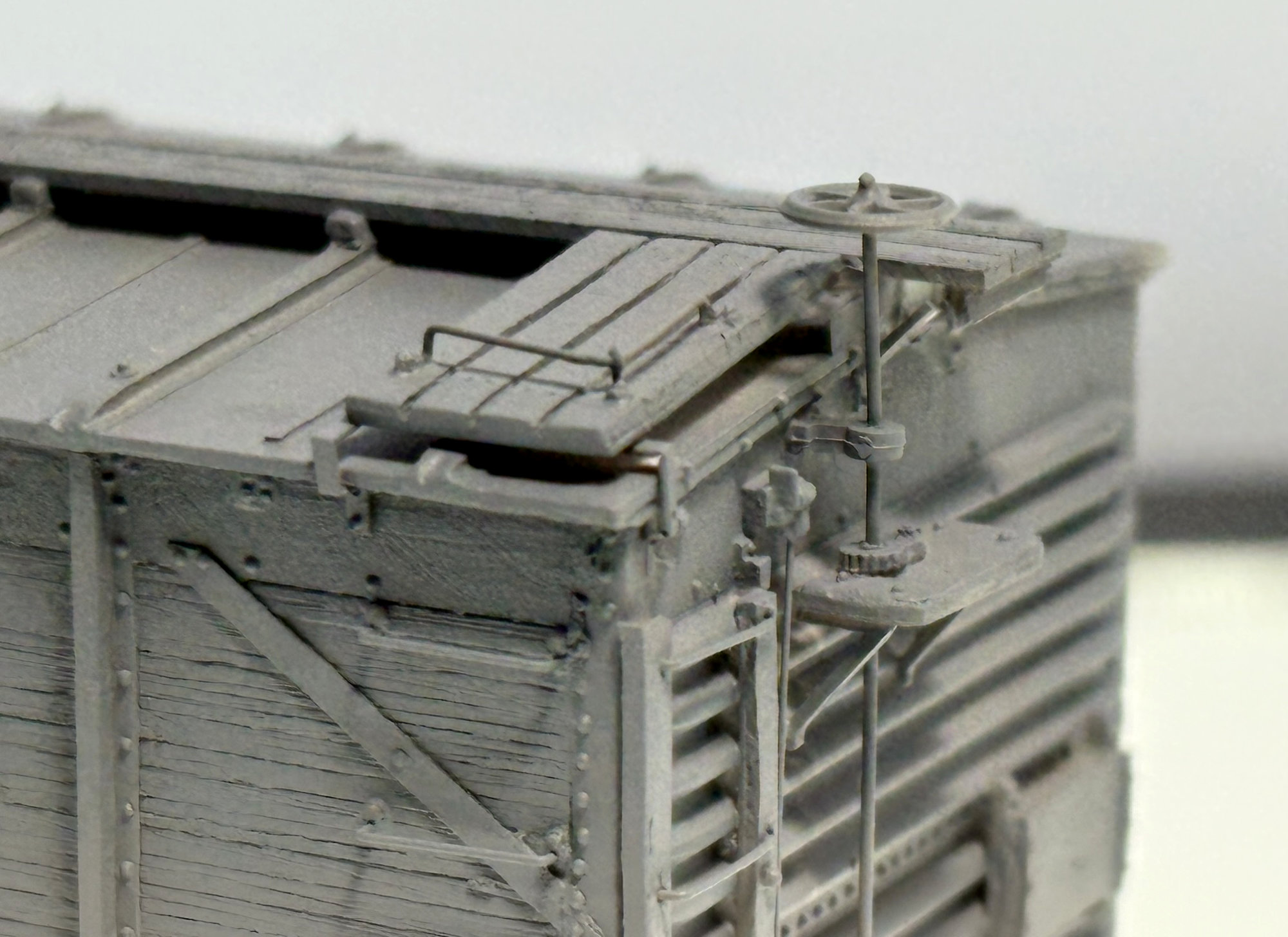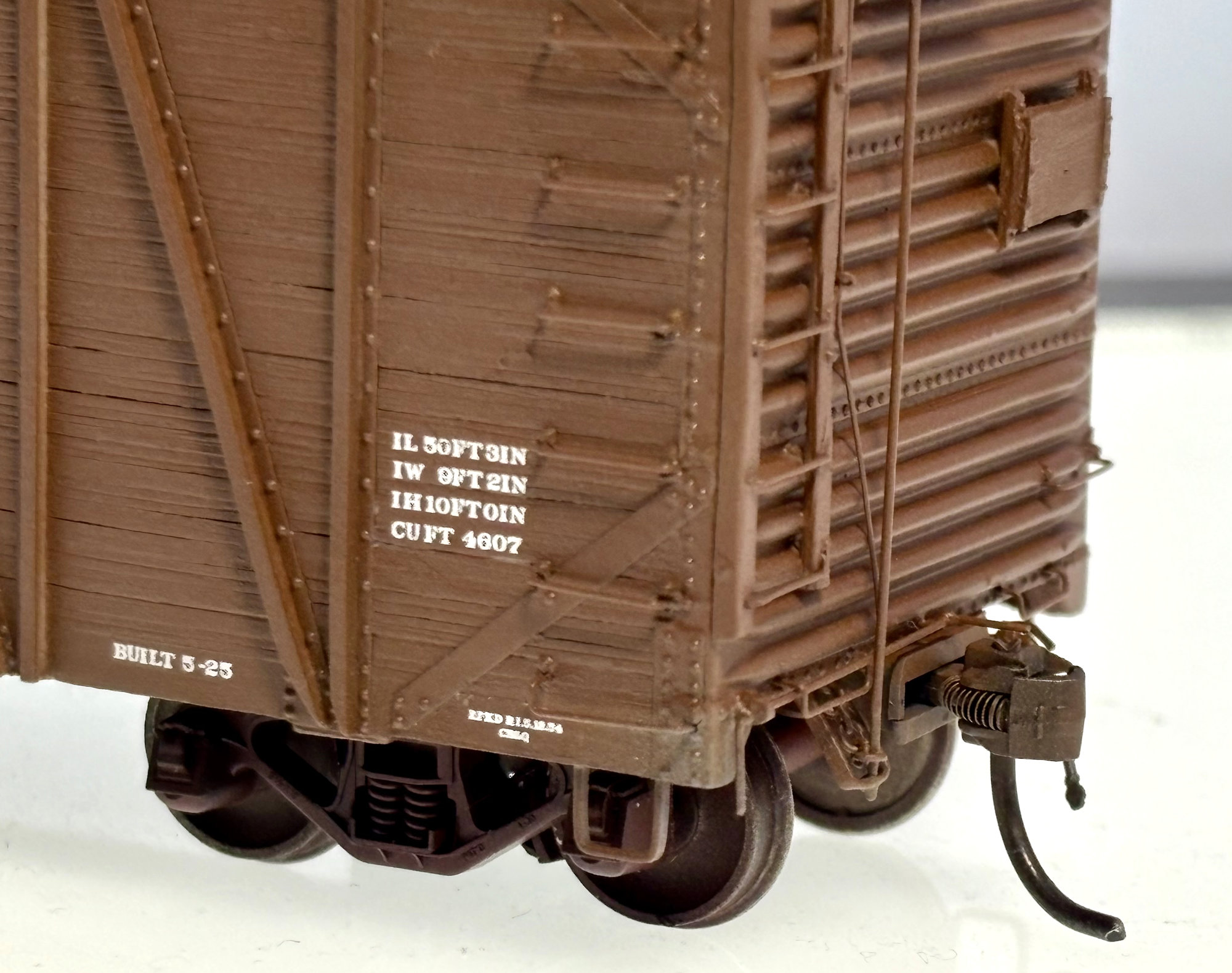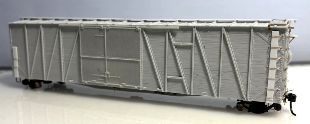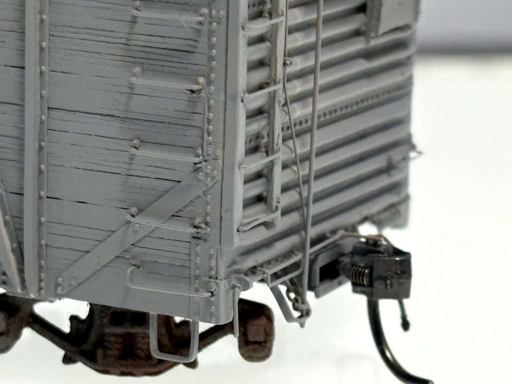 Here’s a mostly completed model. To prevent the grabs from being bent or smashed while I build the model, I install 0.030 x 0.125-inch styrene strips behind the grabs. You can see the white styrene strips on both the right and left side in the above photo.