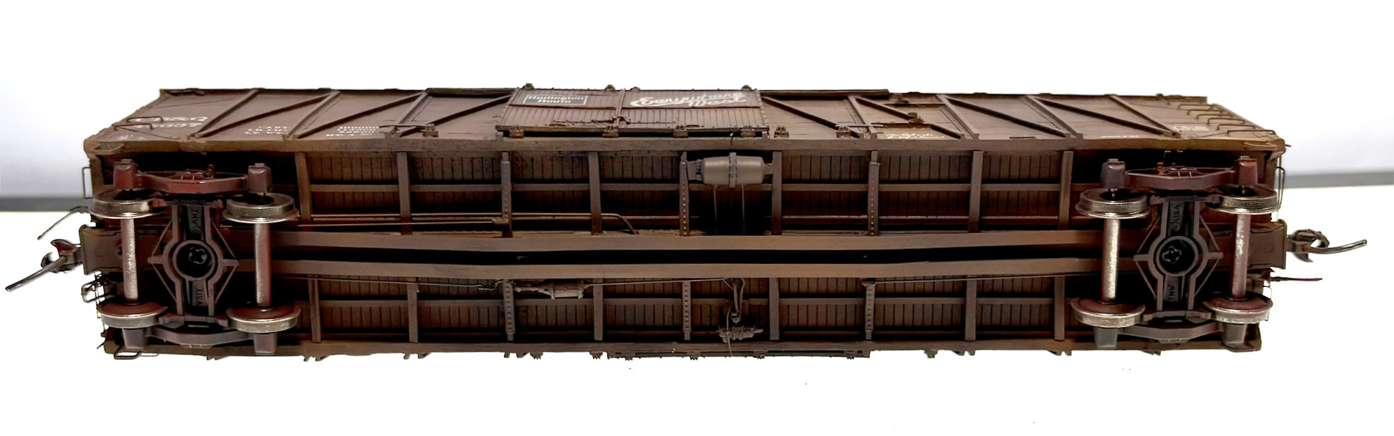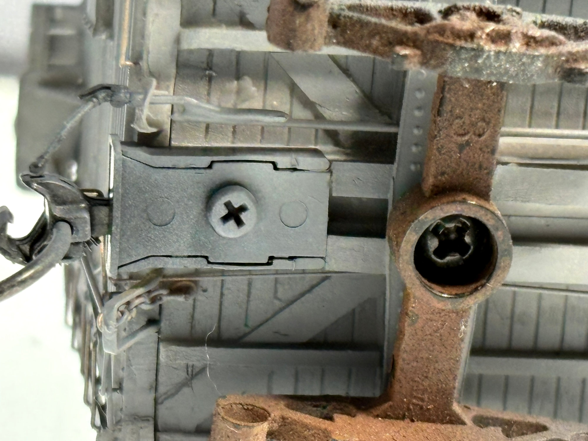 I used a scale size Kadee coupler box (part # 262), as seen above. Bits of Evergreen styrene were installed to fill in the empty space between the rear of the coupler box and the bolster to match the center sill.