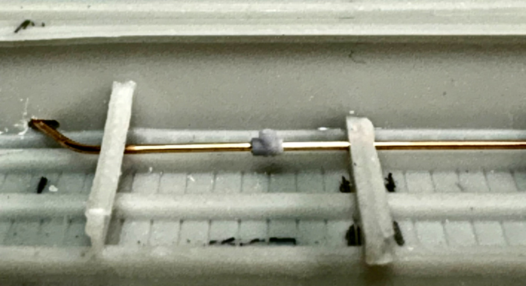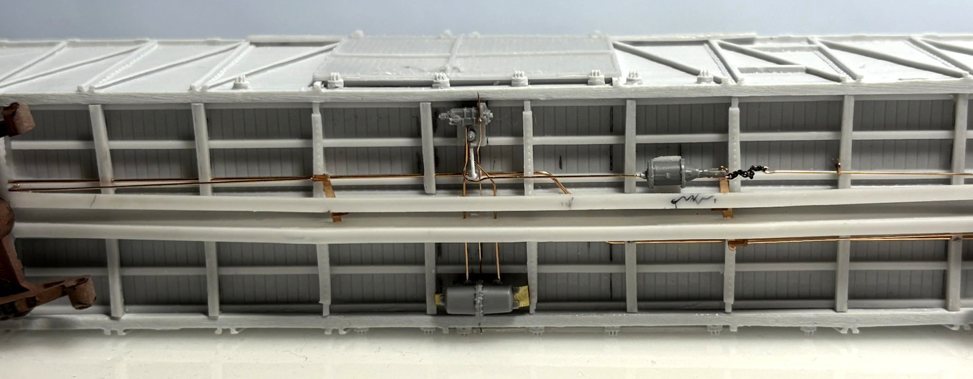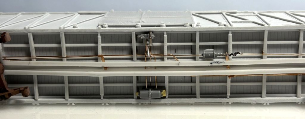The photo above shows the underframe with the 0.020-inch diameter train line routed through the center sill, cross ties and cross bearers. A 3D printed Tee has been added in the location of the control valve. The Tee was designed by Tom Madden and currently printed by David Jobe, Sr. at his company Precision Resin Works LLC., info@precisionresinworks.com .